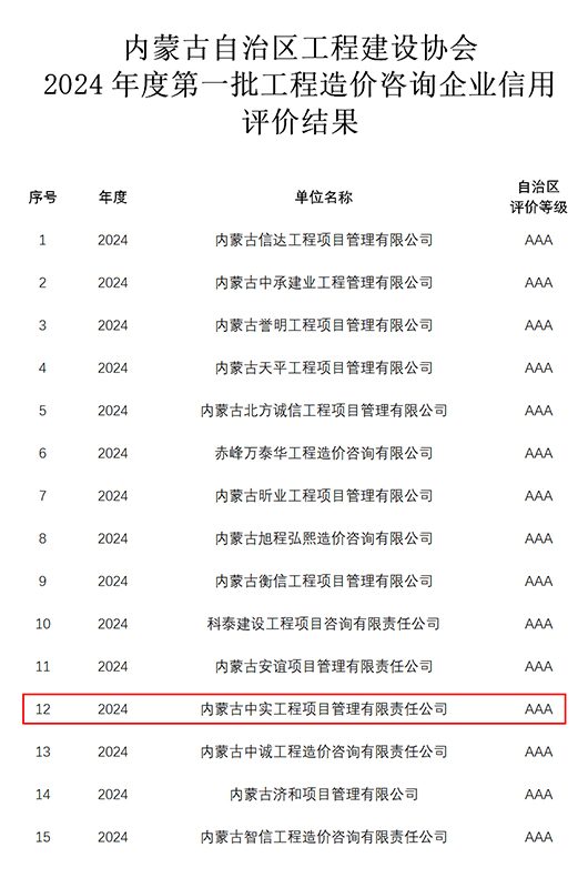 2024-07-3017035 次近期,我公司参加内蒙古自治区工程建设协会组织的“2024年度第一批工程造价咨询企业信用”申报,获得“信用AAA级证书”。我公司成立多年以来,遵循中国工程造价管理协会对造价咨询企…